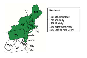 New York has the fourth largest number of active cardholders of any state, with about 227,000 getting federal benefits in this way (Direct Express® Internal Information). It is part of the Northeast Region for Direct Express®, along with 8 other states. This region is home to 17 percent of Direct Express® cardholders with atypical mix of Social Security (SSA) and Supplemental Security Income (SSI) recipients, representative payees, and DX℠ Mobile App users (see graphic).